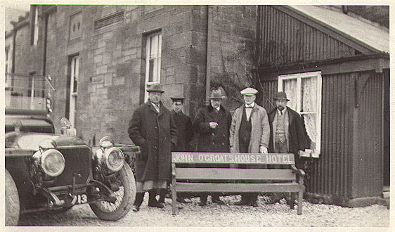 Grupporträtt: Edvard Westermarck i sällskap med tre andra män och en chaufför står framför en bil på gården till ett pensionat (John O'Groats House Hotel).